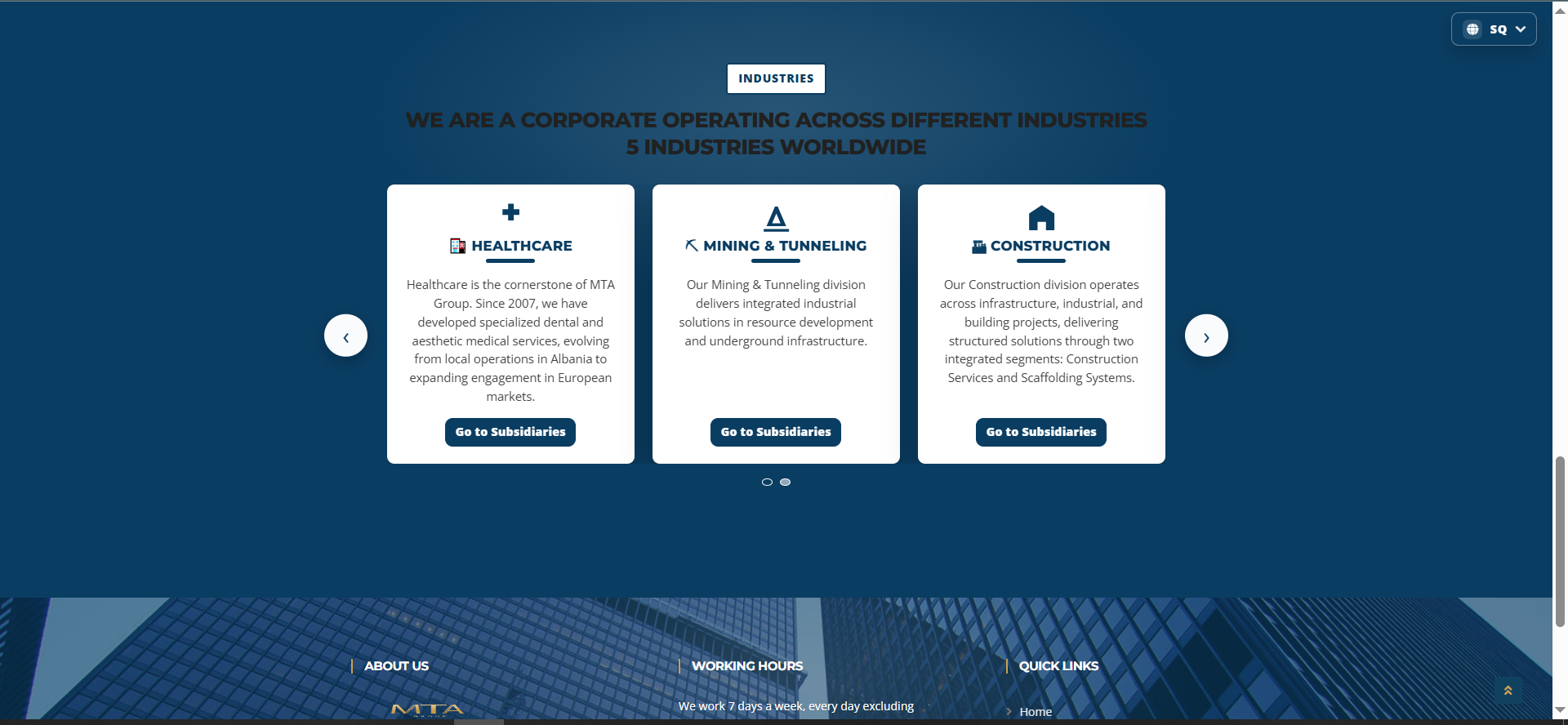 Me një fokus të qartë te rritja e qëndrueshme dhe diversifikimi, MTA Group është zhvilluar në një organizatë shumë-sektoriale që operon në Healthcare, Construction, Mining & Tunneling dhe Business Development. Në çdo sektor, grupi synon investim të përgjegjshëm, standarde të larta operacionale dhe krijim vlere afatgjatë për partnerët, klientët dhe komunitetin.