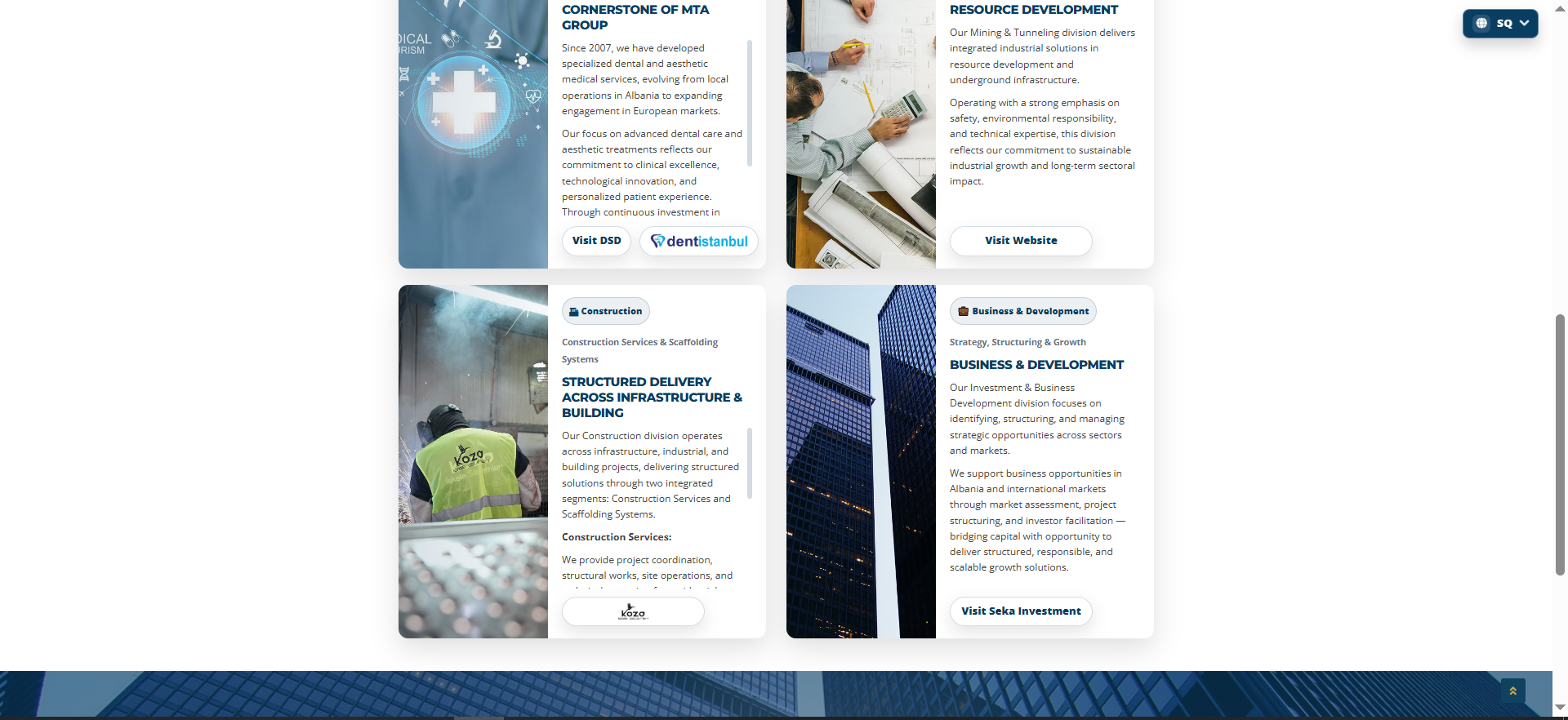Divizionet e grupit përfshijnë turizëm shëndetësor, shërbime dentare dhe estetike mjekësore, zgjidhje për ndërtim dhe skela profesionale, si edhe zhvillim biznesi dhe strukturuar investimesh. Kompania thekson sigurinë, përgjegjshmërinë mjedisore, ekspertizën teknike dhe praktikat e qëndrueshme, ndërsa në prezencën e saj publike liston edhe certifikimin ISO 9001:2017 dhe zyrën qendrore në ABA Center, kati 12, Tiranë.
